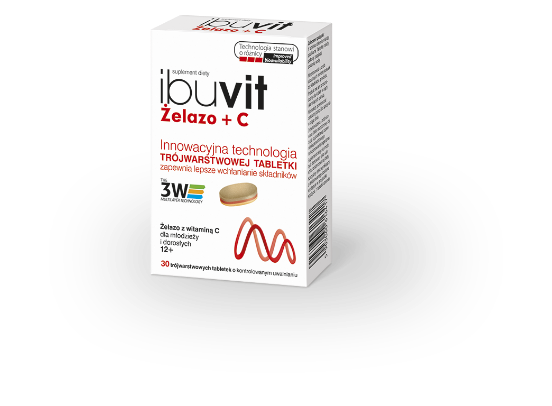 Ibuvit Żelazo + C dzięki technologii 3W MULTILAYER trójwarstowej tabletki zapewnia stopniowe i trójfazowe uwalnianie składników w różnym czasie i w różnych odcinkach przewodu pokarmowego dla optymalizacji wchłaniania składników.